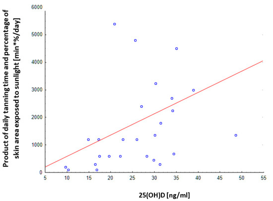 Correlation of the product of the declared tanning time and the percentage of the skin area exposed to sunlight with the concentration of vitamin D determined in the summer period in all surveyed people without vitamin D supplementation. n = 27, Pearson’s R = 0.584, p = 0.0014.