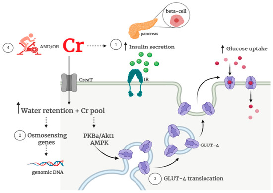 The potential basis for creatine supplementation to improve glycemic control involves: (1) creatine-induced increased insulin secretion; (2) creatine-induced changes in osmoregulation, and (3) creatine-induced increased glucose uptake via an augment in GLUT-4 content and/or translocation. In addition, exercise training has been suggested to have synergistic effects to creatine, leading to the assumption that these combined interventions could foster greater benefits in glycemic control vs. creatine or exercise alone [28]. The potential mechanisms that could explain the potential benefits of creatine, associated or not with exercise, on glucose control are illustrated in Figure 1.