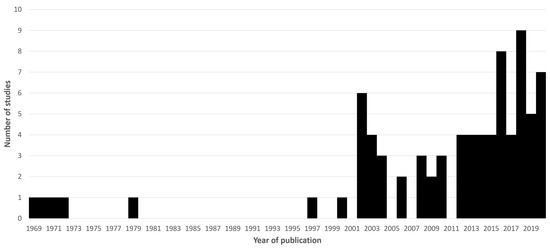 A histogram of eligible papers found in the primary pubmed search according to their year of publication.