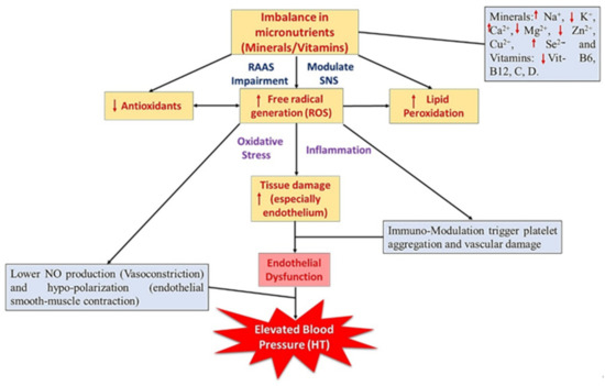 Imbalanced micronutrients (Na+, K+, Ca2+, Mg2+, Zn2+, Cu2+, Se2- and vitamin B6, B12, C, D, and E) and their sequential impact on blood pressure/hypertension. SNS—sympathetic nervous system; RAAS—renin-angiotensin-aldosterone system; Na+—sodium; K+—potassium; Ca2+—calcium; Mg2+—magnesium; Zn2+—zinc; Cu2+—copper; Se2−—selenium.