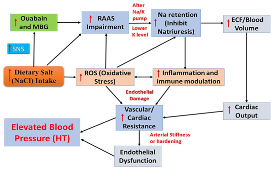 However, the detailed mechanism of Na+ induced HT (salt-sensitive HT) is not fully explored. Nevertheless, few researchers indicated that excess consumption of dietary salts could trigger endogenous cardiotonic steroids (CTSs) like marinobufagenin (MBG) and ouabain by triggering the sympathetic nervous system (SNS). Those CTSs can act as Na+/K+ pump inhibitor and thus alter Na retention (Na+ overload) and alter vascular tone (increase vascular resistance-endothelial dysfunction). Elevated vascular resistance results in damaged endothelium (release free radicals/reactive oxygen species (ROS) and trigger inflammation) and leads to arterial stiffness (loss arterial elasticity) and eventually HT [22,23,24]. Moreover, MBG acts as a vasoconstrictor and thereby elevates BP and also impairs RAAS and increases extracellular fluid (ECF) volume (elevated cardiac output and vascular resistance), which in turn alters the glomerular and vascular hemodynamics, and subsequently increases the blood pressure and results in HT [2,25]. Figure 2 depicts the brief mechanism underpinning sodium or dietary salt (NaCl) induced HT through altering RAAS, cardiac output, and endothelial function (adopted from Chiu et al. [22]).