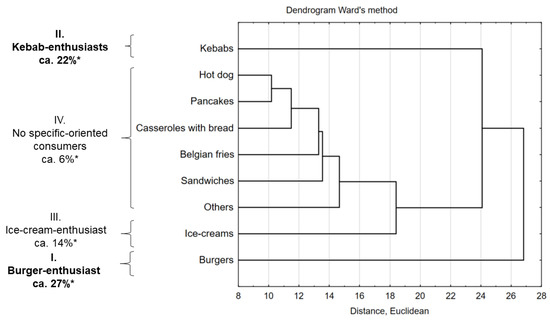 Based on the cluster analysis, the profiles of preferences of consumers using street food were determined (Figure 1). Four profiles were identified: