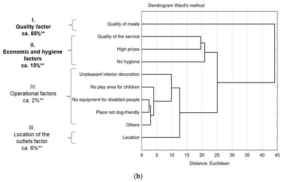 Based on the results and cluster analysis, the factors indicated by the respondents were grouped into factors that determine (Figure 2a) and discourage consumers (Figure 2b) from choosing catering establishments. Factors from both groups were divided into four clusters of factors, of which factors in groups I and II were high or medium decision power, while factors from groups III and IV had a little influence on consumer decisions. The choice of a catering establishment was determined by the following factors: I—preferences and quality, II—economic and food safety, III—socio-economic, and IV—operational. Among discouraging factors for visiting catering establishments, the following were distinguished: I—quality factor, II—economic and hygiene factors, III—location of premises factor, and IV—operational factors.