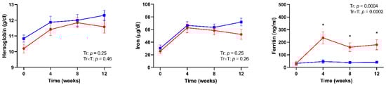 Time-trends of hemoglobin, serum iron, and serum ferritin levels in patients with ulcerative colitis (UC) treated with intravenous ferric carboxy-maltose (red lines) or oral sucrosomial® iron (blue lines). p values for time (T) and treatment by time interaction (Tr × T) effects are shown.