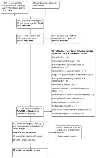 This systematic review extends the information collected for the Cochrane review on dietary interventions for cancer survivors []. During the completion of the Cochrane review, the question on implementation of behaviour change theory emerged. However, behaviour change was not within the scope of the review and agreed protocol. Searches conducted for a previous Cochrane review were updated on 30 September 2020 and an additional inclusion criterion on the use of behaviour change theory was incorporated. We have included only RCTs, however, 11 trials are final reports of large projects [,,,,,,,,,,] that included non-randomised studies and qualitative work. The following databases were searched: The Cochrane Central Register of Controlled trials; Medline via Ovid; Embase via Ovid; the Allied and Complementary Medicine Database; the Cumulative Index to Nursing and Allied Health Literature; and the Database of Abstracts of Reviews of Effects. We also searched other resources, other reviews on the topic, and the International Trials Registry for ongoing trials. Search words were matched with the MESH term truncation systems and Boolean operators “and” with “or” function were used. The search strategy is attached as Supplementary Table S1. The results of the literature searches were uploaded to Covidence, (https://www.covidence.org/ (accessed on 10 December 2020), Melbourne, AU) an online software for data management. Data were checked for duplicates by the software and then manually. The titles and abstracts were independently screened by both Jana Sremanakova and Sorrel Burden based on inclusion and exclusion criteria. Full texts were obtained to identify the eligible publications and checked by both Jana Sremanakova and Anne Marie Sowerbutts Any discrepancy during the process of screening was discussed between Jana Sremanakova, Sorrel Burden, and Anne Marie Sowerbutts. The search results and selection process have been recorded in the PRISMA (Preferred Reporting Items for Systematic Reviews and Meta-Analyses) flow diagram (Figure 1).