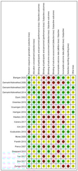 Risk of bias summary for each included study. Note: green (+)—low risk of bias, red (-)—high risk of bias, yellow (?)—unclear risk of bias.