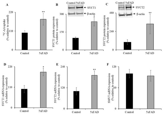 Next, we examined the protein and mRNA expression levels for SVCT1 and SVCT2 by western blot and RT-qPCR, respectively (Figure 3B,C). Both SVCT1 and SVCT2 protein expression levels were markedly increased in the 5xFAD mice jejunum compared to WT littermates. In addition, both SVCT1 and SVCT2 mRNA expression levels were significantly increased in 5xFAD compared to WT littermates (p < 0.01 and p < 0.05 for SVCT1 and SVCT2, respectively; Figure 3D,E). In contrast, we did not find a marked change in the mRNA levels for the SMVT (Figure 3F), a sodium-dependent multivitamin transporter localized at the apical membrane domain of enterocytes that transports another water-soluble vitamin, biotin []. These findings suggest that the upregulation of vitamin C transport system in the AD mice jejunum is substrate-specific.