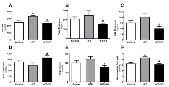 Plasma biochemical profile: (A) fasting glucose (mg/dL), (B) total cholesterol (mg/dL), (C) LDL cholesterol (mg/dL), (D) HDL cholesterol (mg/dL), (E) triglycerides (mg/dL), and (F) NEFA (mmol/L), in animals with diet-induced obesity for 16 weeks. The animals received control diet (Control group) or hyperlipidic diet without (HFD group) or with fish oil supplementation in the last eight weeks (HFD + FO group). Values expressed as mean ± SEM (n = 10–20). * p < 0.05 vs. Control; # p < 0.01 vs. HFD; one-way ANOVA and Tukey post-test.
