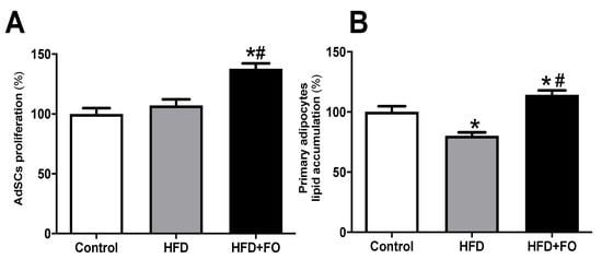 Evaluating the effect of in vivo treatment with FO on the proliferation of primary mouse pre-adipocytes, we observed that the proliferation of AdSCs isolated from the HFD + FO group was higher than CO and HFD groups, 27% and 22%, respectively (Figure 4A).