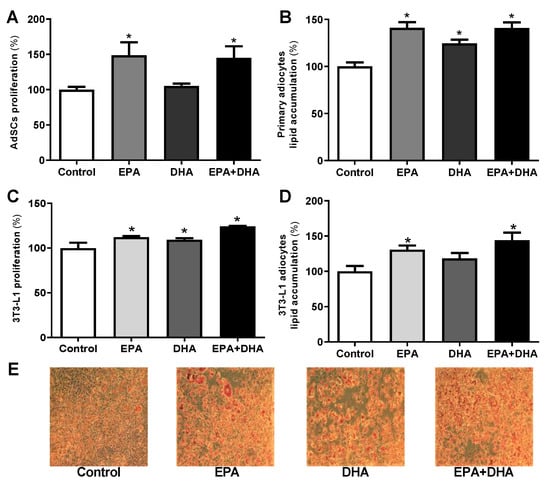 We also evaluated the isolated and combined EPA and DHA treatment on 3T3-L1 preadipocytes. 3T3-L1 preadipocytes treated for 36 h with EPA, DHA, or their association (EPA/DHA) showed an increase in proliferation potential of 11%, 9%, and 20%, respectively, when compared to the control group (Figure 5C). The treatment with EPA (alone or in association with DHA), also increased the lipid accumulation by 24% and 31%, respectively (Figure 5D). These effects were visualized by microscopy after staining (Figure 5E).
