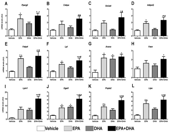 In the same way, concerning the genes that encode proteins that perform lipolysis, we also observed an increase in the expression of Atgl (70% and 81%) and Hsl (74% and 79%), in the cells treated in vitro with EPA, alone or associated to DHA (EPA/DHA), respectively (Figure 6K,L). Interestingly, DHA fatty acid did not show any effect concerning these parameters.