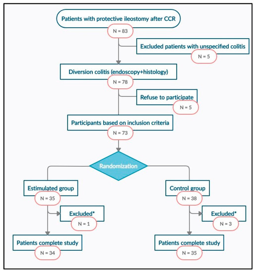 Between January 2017 and December 2018, 83 disease-free patients with protective ileostomy after colorectal carcinoma resection were reviewed and included in the surgical waiting list for intestinal transit reconstruction. Seventy-eight of them met the endoscopic and histological criteria for diversion colitis diagnosis, and 73 patients were finally randomized into two groups, intervention (n = 35) and control (n = 38). Sixty-nine patients completed the study, one of them from SG and three from the CG abandoning the study because of anastomotic fistula. The study flowchart is presented in Figure 1. There were no significant differences between SG and CG in terms of sociodemographic, clinical, or surgical variables (Table 1).