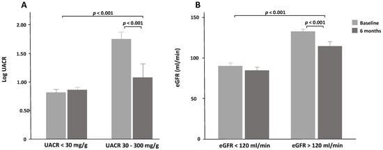 (A): Changes in urinary albumin-to-creatine ratio (UACR) between baseline and 6 months according to UACR baseline status. (B): Changes in estimated glomerular filtration rate (eGFR) between baseline and 6 months according to eGFR baseline status.