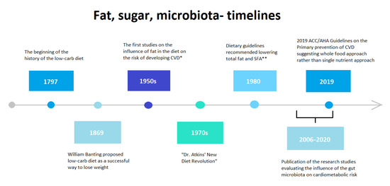 More recent years have highlighted another link to diet and cardiometabolic disease, the gut microbiota, which are involved in the metabolic control of the host [51]. Dysbiotic gut microbiota are thought to be related to cardiometabolic diseases, such as obesity [52], T2DM [53], and CVD [54,55,56], which is why gut modulation strategies, like diet intervention, may provide some possibility for reducing cardiometabolic risk through correcting the microbial gut imbalance. Figure 1 summarizes the timelines related to fat, sugar, and microbiota studies.
