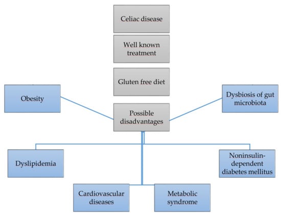 In order to collect the literature data related to the presented topic, the PubMed database (www.pubmed.ncbi.nlm.nih.gov, accessed on 22 April 2020) was explored using the terms: “celiac disease”, “gluten-free diet”, “dyslipidemia”, “obesity”, “diabetes mellitus t.2”, “metabolic syndrome”, “cardiovascular diseases”, “gut microbiota”, and “microbiome gut dysbiosis”.