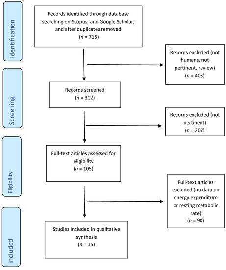 The literature search was conducted in September 2020, and this search retrieved 715 studies that were entered in the flowchart process (Figure 1). Eligible studies were required to report baseline values, follow-up values, and the daily dosage of green tea used to detect effects on energy metabolism parameters, in particular RMR, EE and RQ. Eligible studies were required to consider green tea extracts with no more than 50 mg of caffeine content. Dietary supplementation was considered in both capsule and liquid forms.