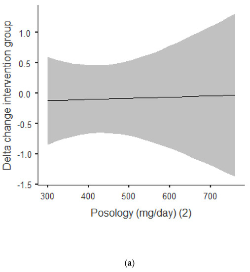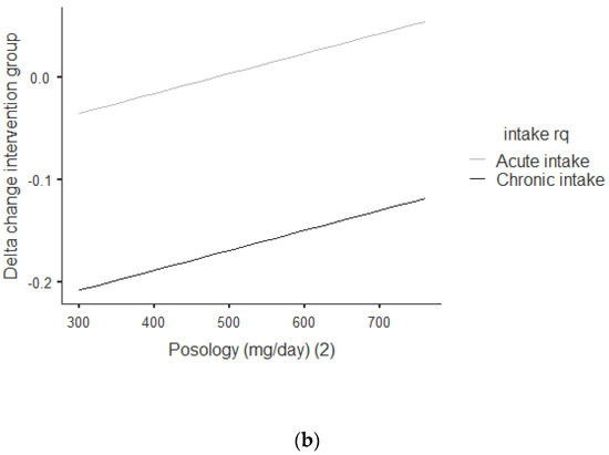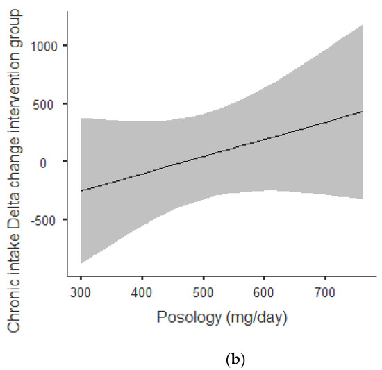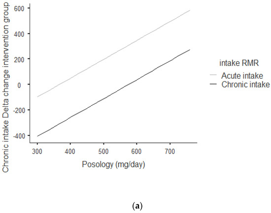 Figure 2a,b shows that there was an overall positive correlation between posology and RMR: the coefficient was r = 0.797 and r2 = 0.636, The association was positive: the increase in posology was related to an increase in RMR. As shown in Figure 2a, this trend was correlated for acute and chronic intake. Between acute and chronic intake, there was not any statistically significant difference for the trend of 0.273.