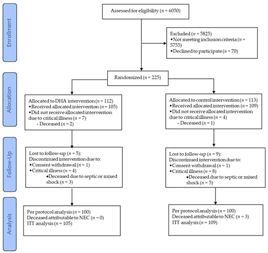 CONSORT diagram depicting the flow of the infants through the study. DHA, docosahexaenoic acid; NEC, necrotizing enterocolitis; and ITT, intent-to-treat.