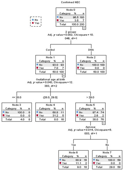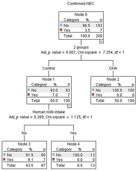 IBM SPSS software version 21 (IBM Corp., Armonk, NY, USA) was used for data analysis. The data distribution was inspected. Data are presented as the median and interquartile range (quartile 25, quartile 75) or (minimum, maximum) for variables with scarce patients. DHA and control groups were compared with the Mann–Whitney-U test, Chi-square test, and relative risk (RR) with a 95% confidence interval (CI). However, as both groups had similar covariates, the infants in the control-group who developed NEC were also compared as an independent group with the DHA-group and the remainder of the infants in the control-group without NEC, using Fisher´s Exact, Kruskal–Wallis, and Mann–Whitney-U tests. Multivariate analysis with decision trees using Chi-square automatic interaction detection (CHAID) regression was applied to identify the predictors of confirmed NEC. In all cases, a p value < 0.05 was considered to be statistically significant. Those preterm infants who received at least one dose of DHA or sham were included in the intent-to-treat analysis using the Chi- square test and RR (95% CI).