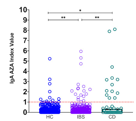 In our patient cohort, the serum IgA AZA levels were significantly higher in patients with CD (median, 0.35 (range, 0–8.1); mean, 1.25) than in IBS patients (median, 0.0 (range, 0.0–5.94); mean, 0.24; p < 0.001) or HCs (median, 0.03 (range, 0.0–5.23); mean, 0.22; p < 0.05; Figure 1). Additionally, significant differences in the serum IgA AZA levels were found between IBS patients and HCs (p < 0.01).