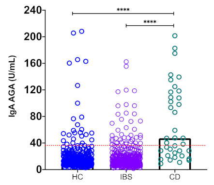 High serum levels of IgA anti-gliadin (AGA) in celiac disease (CD) patients. Cut-off values were calculated and determined as described in the Materials and Methods, and they are shown by dotted lines. Medians values are compared between the groups. **** p <0.0001