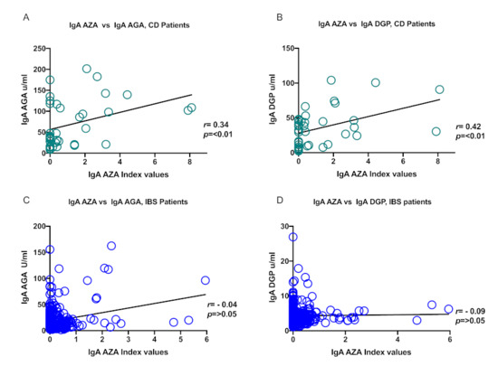 Correlation analysis between IgA AZA and IgA AGA in CD and IBS patients. (A) IgA AZA vs. IgA AGA serum levels in celiac disease patients, (B) IgA AZA vs. IgA DGP serum levels in celiac disease patients, (C) IgA AZA vs. IgA AGA serum levels in IBS patients, (D) IgA AZA vs. IgA DGP serum levels in IBS patients.