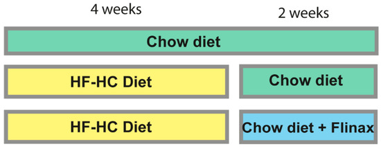 Experimental design. Wistar rats were fed with a high-fat, high-cholesterol diet for 4 weeks in order to induce steatosis. Following this, one group of rats was treated with chow-diet for 2 weeks, while another group was fed with chow-diet supplemented with 2% Flinax. During the entire experiment, a third group of rats was fed with chow-diet only for 6 weeks, serving as the control. HF-HC: high fat high cholesterol.