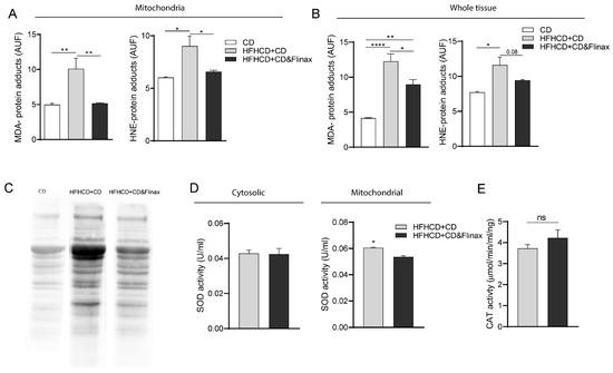 The activity of important ROS scavengers such as catalase (CAT) and cytosolic superoxide dismutase (SOD) was not different between the treated and untreated rats (Figure 3D,E). Moreover, in Flinax-supplemented rats the enzymatic activity of mitochondrial SOD was lower (Figure 3D), underlying the fact that in treated rats the induction of scavenging systems was not required. Overall, these results suggested that the administration of Flinax protected the liver, reducing steatosis and oxidative stress.