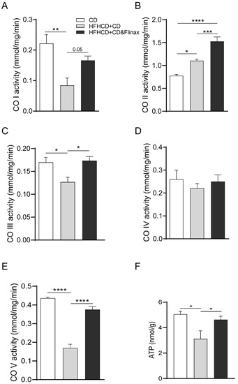 Flinax enhances respiratory chain complexes activity. (A) Complex I enzymatic activity; (B) Complex II enzymatic activity; (C) Complex III enzymatic activity; (D) Complex IV enzymatic activity; (E) ATP-synthase (Complex V) activity. (CD = n4–6; HFHCD+CD = n8; HFHCD+CD&Flinax = n8). (F) ATP content in liver tissue (CD = n4; HFHCD+CD = n6; HFHCD+CD&Flinax = n6). Data are expressed in mean ± SEM; * p < 0.05; ** p < 0.01; *** p < 0.001; **** p < 0.0001 according to Student’s t test for comparison between two groups, or one-way ANOVA followed by post-hoc analysis with Bonferroni test for comparison between more groups; CD, chow diet; HFHCD, high-fat, high-cholesterol diet; CO, complex.
