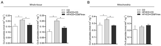 Flinax inhibits peroxide production. (A) Peroxide production from pyruvate/malate (complex I) and succinate (complex II), performed in whole tissue homogenate (CD = n4–6; HFHCD+CD = n8; HFHCD+CD&Flinax = n8); (B) Peroxide production from pyruvate/malate (complex I) and succinate (complex II), performed in isolated mitochondria (CD = n4–6; HFHCD+CD = n8; HFHCD+CD&Flinax = n8); Data are expressed in mean ± SEM; * p < 0.05 according to Student’s t test for comparison between two groups, or one-way ANOVA followed by post-hoc analysis with Bonferroni test for comparison between more groups; CD, chow diet; HFHCD, high fat high cholesterol diet; Co-I, complex I; Co-II, complex II.
