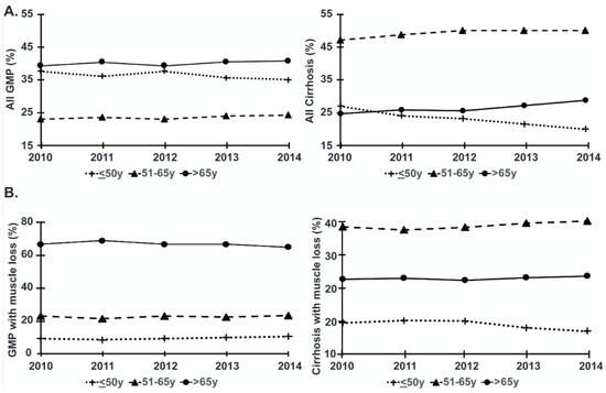 Increasing proportion of older patients with cirrhosis with and without muscle loss phenotype. (A) Line graphs depicting percentage of the analyzed random 2% inpatient sample of the general medical population (GMP) and hospitalized patients with cirrhosis from the National Inpatient Sample (NIS) database each year from 2010–2014 who were ≤50, 50–64, and >65 years old. (B) Line graphs depicting percentage of the analyzed inpatient sample of those GMP or patients with cirrhosis with muscle loss phenotype each year from the NIS from 2010–2014 who were ≤50, 50–64, and >65 years old.