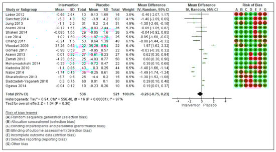 In the 17 studies [27,28,29,30,31,32,33,34,35,36,37,38,39,40,41,42,43,44,45,46,47,48], with a total of 1057 subjects (536 in the intervention group and 521 in the control group), the overall effects showed that the treatment with probiotics did not significantly change the body weight (−0.26[−0.75, 0.23], p = 0.30) in the considered studies. τ2 (estimate of the between-studies variance in random-effect meta-analysis) = 0.94, χ2 = 556.40, df = 16 (p < 0.00001). I2 (statistically describing the percentage of variation across studies that is due to heterogeneity) = 100%.