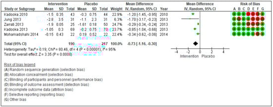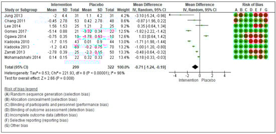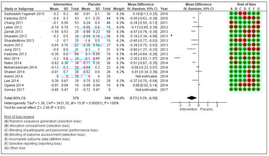 Figure 2 describes the meta-analyzed mean difference for random effects showing a significant decrease in BMI for the consumption of probiotic supplements. In a total of 18 studies, with a total of 1123 subjects (579 in the intervention group and 544 in the control group), the test of overall effects indicates that the treatment effect was significantly different (−0.73[−1.31, −0.16], p = 0.01) between the considered studies. τ2 (estimate of the between-studies variance in random-effect meta-analysis) = 1.36, χ2 = 3431.35, df = 15 (p < 0.00001).