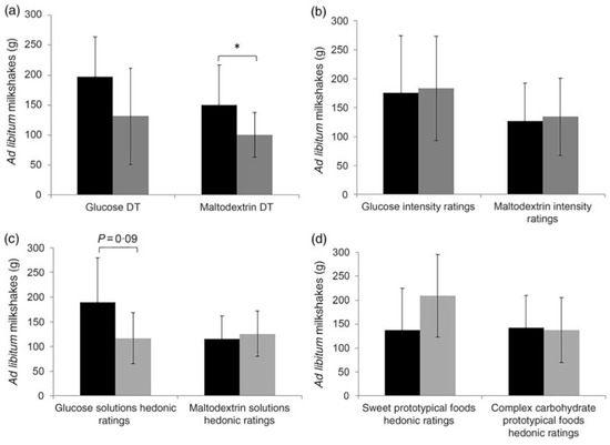 (a,b) Ad libitum milkshake intake means and standard deviations between more sensitive and less sensitive participants or those who experienced high and low intensity ratings. (c,d) Ad libitum milkshake intake means and standard deviations between participants with high hedonic ratings and low hedonic ratings for both sweet and complex carbohydrate solutions and prototypical foods. For sweet taste function and sweet hedonic ratings, comparisons were only made for sweet (glucose) milkshakes, and vice versa for complex carbohydrate (maltodextrin). * p = 0.01. DT = Detection threshold (reproduced with permission from the authors [108]).