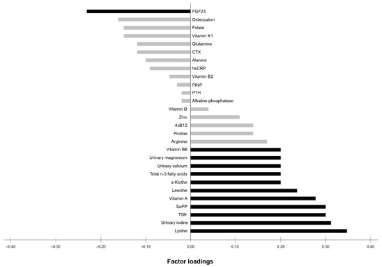 An exploratory RRR was applied to investigate the relationship between bone health (BUA and SOS) and the profile of 28 nutrition- and bone-related biomarkers. The first derived biomarker pattern score explained 34.4% of the total variance in BUA and SOS (35.9% for BUA, 32.9% for SOS). Twelve out of the 28 biomarkers were identified to contribute most to bone health. This pattern consisted of the following main contributors (factor loading of ≥0.20) with positive factor loadings for lysine (0.35), urinary iodine (0.31), TSH (0.30), SePP (0.30), vitamin A (0.28), leucine (0.24), α-klotho (0.20), total n-3 fatty acids (0.20), urinary calcium (0.20), urinary magnesium (0.20), and vitamin B6 (0.20), and negative factor loading for FGF23 (−0.23) (Figure 1).