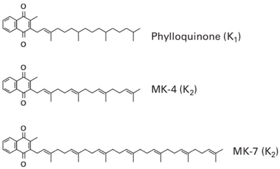 This allows menaquinones to be abbreviated to menaquinone-n (MK-n), where the n relates to the number of repeats of the prenyl units. The most commonly found menaquinones are MK-4 and MK-7; however, the number of lipophilic side chains can range from 4–14. Although vitamin K3, K4 and K5 exist, they are only available as a synthetic form []. Whilst vitamin K3 is often fed to chickens, which then convert this into vitamin K2 [], the aforementioned variants of vitamin K will not be discussed in this report, as this is exclusively an investigation of the direct use of vitamin K on human patients.