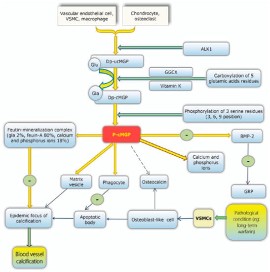 Progression of vascular calcification. This process highlights the importance of carboxylated MGP in its ability to adopt its properties once vitamin K and GGCX do so. However, once the MGP protein becomes phosphorylated, it then has specific physiological functions, such as inducing phagocytes to remove apoptotic bodies, chelating to calcium and phosphorus ions and stimulating the production of osteocalcin, which all prevent the calcification of vessels. Bone Mineral protein (BMP), Gla-rich protein (GRP), Vascular smooth muscle cells (VSMCs) [].
