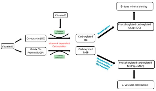 Metabolism of vitamin D and K. The active form of vitamin D can act as a transcription activator for the synthesis of OC and MGP. These are then carboxylated through the co-factors γ-glutamyl carboxylase and vitamin K. These proteins need to be further phosphorylated to enable normal physiological functions shown above, including phosphorylated carboxylated OC resulting in increased bone mineral density and phosphorylated carboxylated MGP decreasing vascular calcification. Multiple studies have demonstrated that vitamin D and K have a synergistic effect, and the diagram above outlines how they can be used in combination to prevent fractures in both healthy and osteoporotic subjects, as well as reducing vascular calcification. [].