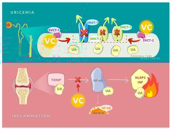 Current research sheds new light on another mechanism of urate-induced inflammation connected with the role of thioredoxin-interacting protein (TXNIP) in nuclear factor-κB (NF-κB) signaling and its interaction with NOD-like receptor protein 3 (NLRP3). It results in the activation of the NLRP3 inflammasome. TXNIP protein and eventually urate-induced inflammation can be successfully inhibited by vitamin C as an antioxidant [32,33].