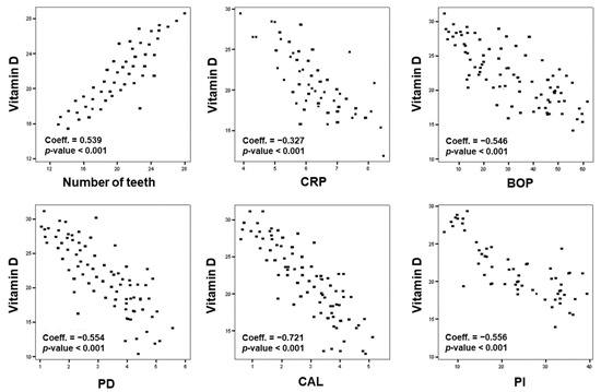 The Spearman correlation analysis evidenced that serum vitamin D was positively correlated with the number of teeth (p < 0.001) and a negative correlation with high levels of CRP (p < 0.001), CAL (p < 0.001), PD (p < 0.001), BOP (p < 0.001), and PI (p < 0.001) (Figure 2).