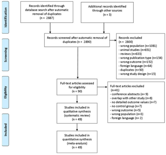The database search identified 2890 unique publications for abstract screening, which lead to the exclusion of 2800 papers (as illustrated in Figure 1). Following the review of full-texts, a final sample of 49 studies (1.7%) were identified for data extraction and meta-analysis (see Supplementary Materials Table S6 for exclusion details). For the studies included in the longitudinal assessment, only data following psychotherapeutic and (free) refeeding were included. For studies that provided medical interventions (such as ghrelin, oestrogen, or relamorelin administration) only placebo conditions were included if available. We were not informed of any additional published datasets after contacting study authors for additional or missing data.
