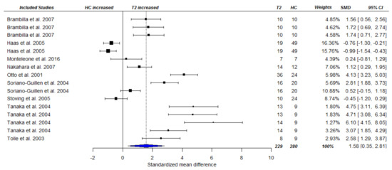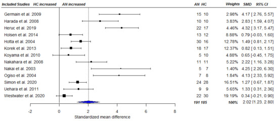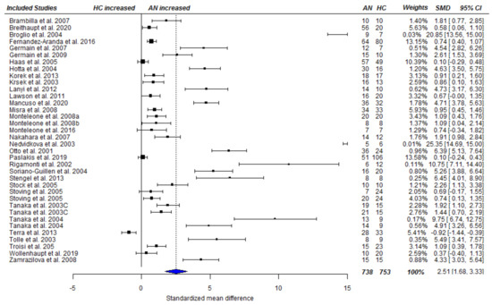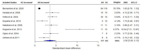 The second approach compared the same data of AN patients during or after treatment (post-treatment or follow-up) to HCs, to establish whether ghrelin levels were still elevated in AN patients in comparison to HCs. Several studies provided multiple follow-up time-points [28,29,48,58]. All studies included in the longitudinal assessment above, except one that did not provide data on HCs [77], were included again. In addition to studies with follow-ups on acute AN patients as mentioned above, we also included two cross-sectional studies that compared weight-restored AN individuals with HCs [42,60]. The average follow-up duration was 93 days post-baseline. Pooling data resulted in the inclusion of nine studies yielding 16 effect sizes (based on 175 AN patients and 133 HCs, yielding 229 and 280 data points, respectively) for the meta-analysis. Compared to HCs, AN patients had significantly higher total ghrelin levels (SMD = 1.58, CI [0.13, 3.03], p = 0.036; see Figure 6). Heterogeneity was high (Ƭ2 = 3.47, I2 = 94.48%). Sensitivity analysis confirmed the robustness of the results under different assumptions for rho in both approaches (Supplementary Materials, Table S8E).