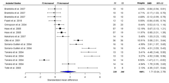 Mean duration between baseline and follow-up was 94.62 days (for details see data extraction table: Supplementary Materials, Table S7). Four studies [28,29,48,58] reported multiple follow-ups. The nine studies provided 16 follow-up time points, which included a total of 200 patients at baseline and 162 at follow-up in the analysis (providing n = 320 T1 and n = 244 T2 data points). Between baseline and follow-up, total ghrelin decreased significantly (positive SMD values indicate a decrease in total ghrelin to the follow-up time point), SMDtotal=1.71, CI [0.45, 2.97], p = 0.014), see Figure 5. Heterogeneity of the pooled effect size was high (Ƭ2 = 2.70, I2 = 94.83%), and sensitivity analyses showed robustness of Ƭ2 in dependence of rho (Supplementary Materials, Table S8D). The results from a subsample of six studies providing 11 effect sizes (due to missing data) showed no association between moderators (age, BMI at baseline, BMI delta, duration to follow-up) and effect size (Table 2). A second meta-regression looking at assay type and quality of evidence, showed a significant effect for quality of evidence on effect sizes (SMD = −1.11, CI [−1.73–0.49], p = 0.001, in the quality only model. Results indicate that effect sizes between baseline and follow-up got larger (stronger decrease in ghrelin at T2) with reduced quality of study. Quality of study was no longer significant in the combined model (see Supplementary Materials, Table S9D).