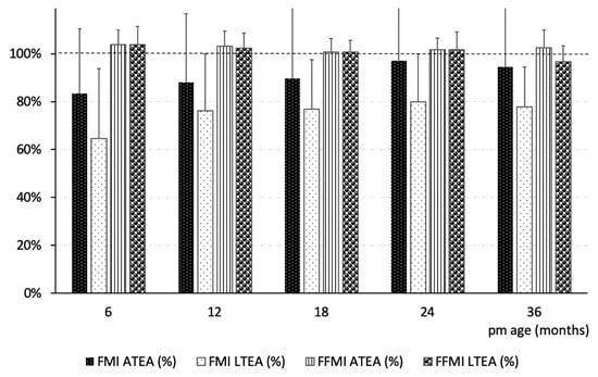 At 6 months of age ATEA infants, in contrast to term infants, were significantly leaner (less FM, less FM%, less FMI). From that time on ATEA infants were, as a group, always between term and LTEA infants; however, the study was underpowered to prove significance.