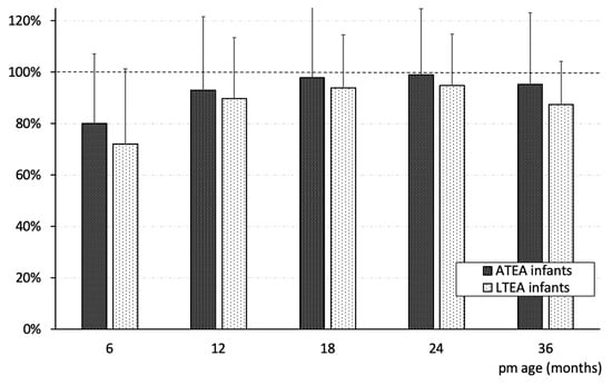 LTEA infants had lower mean Psychomotor Developmental Index PDI (83.7 ± 16.2 vs. 105.4 ± 15.2, p < 0.001) and lower mean Mental Developmental Index MDI (93.3 ± 26.8 vs.108.3 ± 14.1, p < 0.001) than term infants at two years corrected age. In ATEA infants mean PDI (90.9 ± 11 vs. 105.4 ± 15.2, p < 0.001) and mean MDI (93.8 ± 14 vs.108.3 ± 14.1, p < 0.001) were also lower than in term infants at two years corrected age. No significant differences were found between LTEA and ATEA preterm infants in PDI (p = 0.062) and MDI (p = 0.93), respectively.