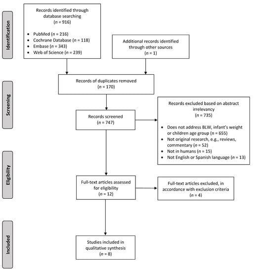 APA StyleMartinón-Torres, N., Carreira, N., Picáns-Leis, R., Pérez-Ferreirós, A., Kalén, A., & Leis, R. (2021). Baby-Led Weaning: What Role Does It Play in Obesity Risk during the First Years? A Systematic Review. Nutrients, 13(3), 1009. https://doi.org/10.3390/nu13031009