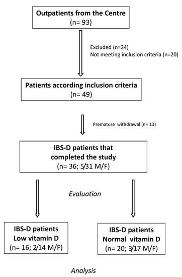 - Jalili, M.; Vahedi, H.; Poustchi, H.; Hekmatdoost, A. Effects of Vitamin D Supplementation in Patients with Irritable Bowel Syndrome: A Randomized, Double-Blind, Placebo-Controlled Clinical Trial. Int. J. Prev. Med. 2019, 10, 16. [Google Scholar] [CrossRef]