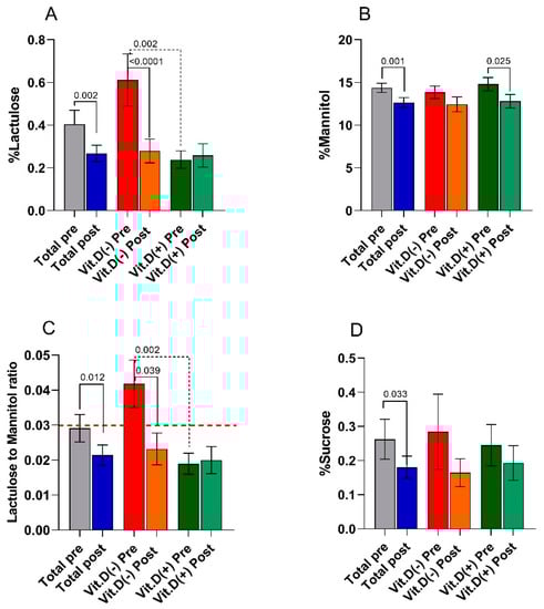 Small intestinal permeability as evaluated by the sugar absorption test (panel (A) =% lactulose; panel (B) =% mannitol; panel (C) = La/Ma ratio; panel (D) =% sucrose) before (pre) and after (post) 12 weeks of low FODMAP diet in the IBS-D patients considered as a total group and categorized in L-VD and N-VD subgroups according to their low or normal VD levels at baseline. Data expressed as means ± SEM. Wilcoxon rank-sum test (solid line) was used to compare pre- and post-treatment data. The Mann–Whitney test (black dotted line) was applied in comparing the two subgroups before and at the end of the diet. Differences considered significant at p < 0.05. Red dotted line indicates the cutoff value of the La/Ma ratio (0.030).