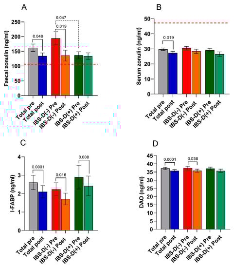 The fecal zonulin concentrations of the whole group of IBS-D patients were far above the cutoff level of 107 ng/mL, irrespective of VD levels and the nutritional treatment. As regards the effect of diet, the total group of IBS-D patients had significantly (p = 0.048) lower fecal zonulin concentrations (134.4 ± 10.12 ng/mL) than those at the start of the diet (162.22 ± 12.66 ng/mL). In addition, serum zonulin values significantly decreased at the end of the diet (29.75 ± 0.86 ng/mL vs. 27.33 ± 1.06; p = 0.019). As for the intestinal barrier integrity, the post-diet concentrations of I-FABP and DAO were significantly (p < 0.001) lower than the pre-diet concentrations in the whole IBS-D group.