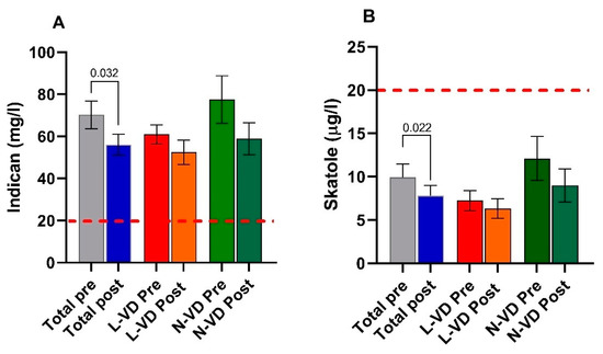 Indican (panel (A)) and skatole (panel (B)) levels as markers of dysbiosis before (pre) and after (post) 12 weeks of low FODMAP diet in the whole group of IBS-D patients and categorized in L-VD and N-VD subgroups according to their low or normal VD levels at baseline. Data expressed as means ± SEM. Wilcoxon rank-sum-test was used to compare pre- and post-treatment data. The Mann–Whitney test was applied in comparing the two subgroups before and at the end of the diet. Differences considered significant at p < 0.05. Red dotted lines indicate the cutoff value.